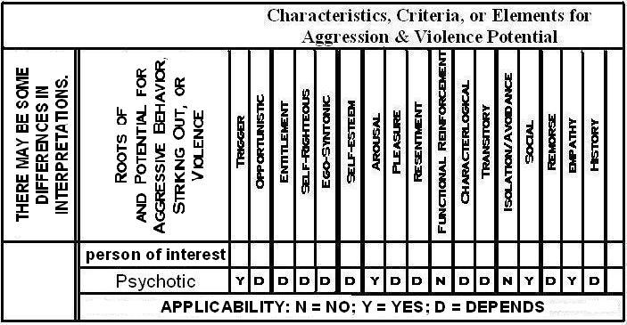 PSYCHOTIC: YES, Specific Triggering EventPSYCHOTIC: DEPENDS, Opportunistic BehaviorPSYCHOTIC: DEPENDS, Sense of EntitlementPSYCHOTIC: DEPENDS, Self-Righteous AttitudePSYCHOTIC: DEPENDS, Ego-syntonic PerceptionPSYCHOTIC: DEPENDS, Self-Esteem Gain or LossPSYCHOTIC: YES, Intense Emotional ArousalPSYCHOTIC: DEPENDS, PleasurePSYCHOTIC: DEPENDS, ResentmentPSYCHOTIC: NO, Functional Reinforcement (positive or negative)PSYCHOTIC: DEPENDS, Characterlogical Behavior/PerceptionsPSYCHOTIC: DEPENDS, Transitory Behavior/PerceptionsPSYCHOTIC: NO, Isolation/Avoidance BehaviorPSYCHOTIC: YES, SocialPSYCHOTIC: DEPENDS, Presence of RemorsePSYCHOTIC: YES, EmpathyPSYCHOTIC: DEPENDS, History