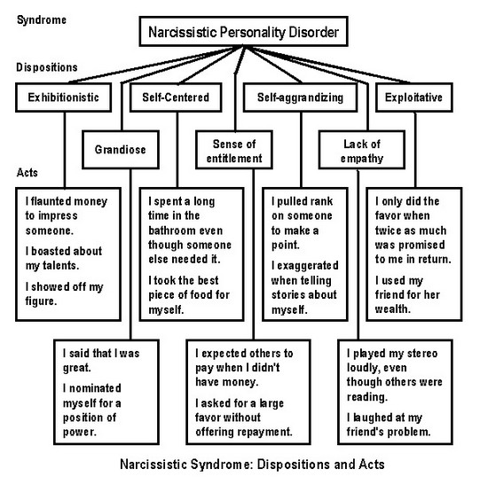 "Narcissistic acts. He looked in the mirror constantly; she baited others for compliments; he asked others how he looked; he bragged about his academics and other accomplishments (e.g., athletics); she asked others questions, insulting their intelligence; he compared himself favorably to others; she put others down (e.g., accomplishments, appearance); he told people he could date anyone.Exhibitionistic acts. He became the life of the party; she flaunted money to impress someone; she talked loudly so that others would hear her story; he disagreed for the sake of attention; she became wild at the party; he walked around with no shirt on; she kissed passionately in public; he showed off his possessions.Grandiose acts. He expected others to step aside when he walked by; she avoided talking to people she considered to be "low life"; he said that he was great; she took charge of the meeting; he claimed that he was the best at something; she exaggerated her role in the sporting event; he nominated himself for a position of power.Self-centered acts. He did not ask his partner what she wanted before making the decision for the two of them; she assumed that someone else should pay for dinner when she was low on cash; he insisted that he be heard, but would not listen; she refused to share her food with others; he cut into a long line ahead of his turn; she turned the TV to her channel without asking what the others wanted; he asked others to conform to his schedule.Acts of entitlement. He used something without replacing it; she asked a large favor without offering repayment; he showed up at an odd hour and expected to be entertained; she invited herself to a social event; he demanded sexual favors because of love; he made a collect call to a friend; she took the last piece of dessert without asking if anyone else wanted it; he told his parents that they should do things for him because they were his parents.Self-aggrandizing acts. He pulled rank on someone to make a point; she played up her achievements; he discussed how much money he had; she associated only with people of high status; he talked about his good points; she pointed out the faults of others; he appointed himself director when he saw what was needed; she arrived late to make a grand entrance; he talked about his success with the opposite sex.Lack of empathy acts. He did not show much feeling when his friend was upset; she did not get upset over the death of a friend; he did not listen to other people's problems; she did not understand someone because she kept interrupting them; he refused to have pity for people with economic problems because he figured it was their own fault; she threw stones at an animal she didn't like; he ignored a friend who was sad.Exploitative acts. He used his friend to gain a better social life; she asked her parents for extra money; he insisted that his friend drop everything to see him; she did the favor only when twice as much was promised in return; he spent time with her only when no one else was around; she used her friend for her wealth; he asked someone else to do his work for him" (Buss and Chiodo, 191, page 187-88).