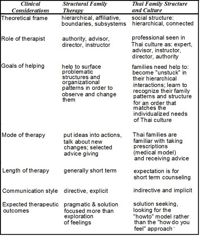 The following is a chart that summarizes several clinical considerations of structural family therapy in comparison to Thai family structure and culture. Aside from communication style, there is marked match between the two.