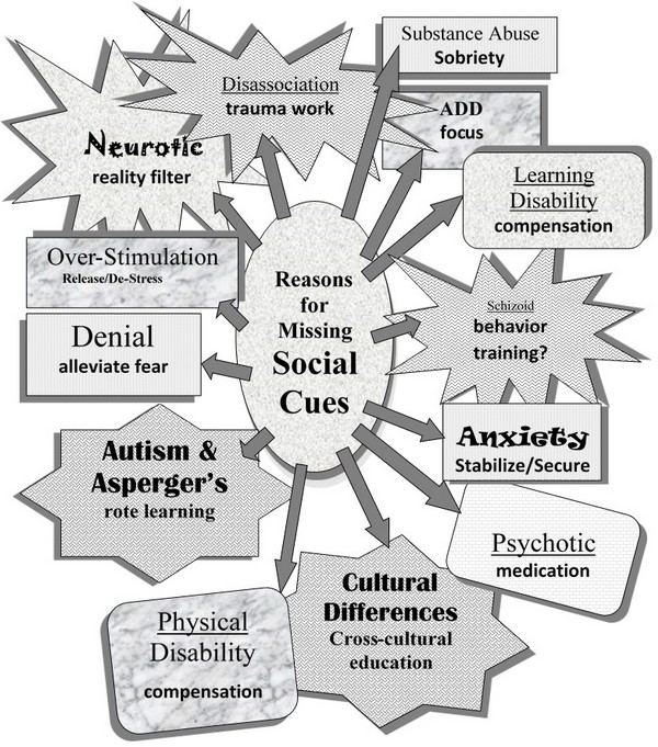 1. Physical Disability2. Cross-cultural Issues3. Overstimulation4. Denial5. Anxiety6. Neurosis7. Disassociation8. Intoxication/Substance Abuse9. Schizoid Personality Disorder10. Psychosis11. Aspergers Syndrome12. Learning Disabilities13. Attention Deficit Disorder (and Attention Deficit Hyperactivity Disorder)