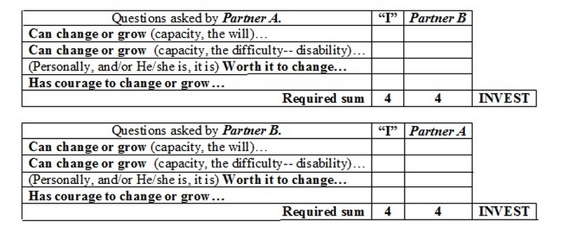 5. Do I (Arthur) think my partner (Nancy) can change or grow- does he or she have the capacity… that is the will to change or grow?6. Do I think my partner can my partner change or grow- does he or she have the capacity… this time, meaning the ability or skills to change or grow (or can acquire them)?7. Do I think my partner feel it is worth it for him or her to change?8. Do I think my partner has the courage to change or grow? Is he or she going to be able to deal with the pain it takes to change?