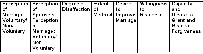 I. Satisfying (prior to affair), voluntary, committed to one’s spouse, committed to improving the marriage and to resolving the infidelity.II. Unsatisfying (prior to affair), voluntary, committed to one’s spouse, committed to improving the marriage and resolving the infidelity.III. Unsatisfying (prior to affair), voluntary, not committed to one’s spouse, not committed to improving the marriage or resolving the infidelity but no better alternatives to marriage are perceived to be available at the time.IV. Unsatisfying (prior to the affair), voluntary, not committed to one’s spouse, not committed to improving the marriage or resolving the infidelity but better alternatives are perceived to be available. Person plans to leave the marriage.V. Satisfying (prior to affair), non-voluntary, committed to one’s spouse, committed to improving the marriage and to resolving the infidelity.VI. Unsatisfying (prior to affair), non-voluntary, committed to one’s spouse, committed to improving the marriage and resolving the infidelity.VII. Unsatisfying (prior to affair), non-voluntary, not committed to one’s spouse but committed to maintaining the marriage and improving the relationship without necessarily resolving the infidelity.VIII. Unsatisfying (prior to affair), non-voluntary, not committed to one’s spouse but committed to maintaining the marriage with no desire to improve the relationship or to resolving the infidelity (Bagarozzi, 2008, page 7-8).