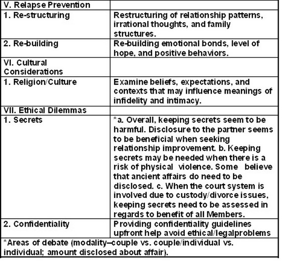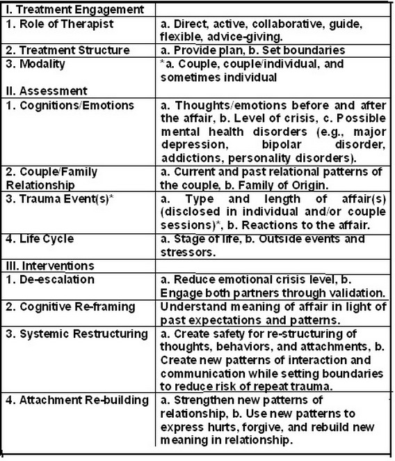 Create a safe, trusting environment for the clients to examine and explore their relationship,Provide a structured environment for the clients to feel equally validated and guided in the process of therapy,Examine the emotional, behavioral, and cognitive reactions to the trauma of infidelity,Explore past and present patterns of the relationship,Explore past and present expectations and meanings of the relationship, (f) Provide a structured process of self-disclosure to allow for understanding and a means of rebuilding attachment and trust,Examine new patterns, meanings, and expectations of the relationship on a structural, behavioral, emotional, and cognitive level in order to maintain trust, andExplore the process of forgiveness and mutual healing.