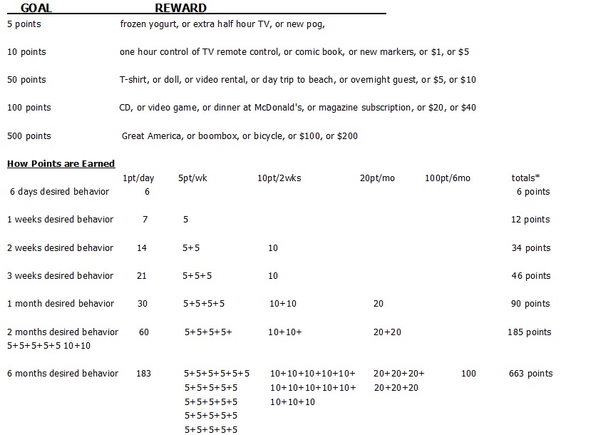 - Frequency and/or consistency should be rewarded.- The greater the goal, the greater the reward. Achieving minor goals should result in minor rewards; more substantial goals have more substantial rewards; major goals have major rewards.- Children choose rewards (through negotiation with adults).- Adults choose goals (through negotiation with children).